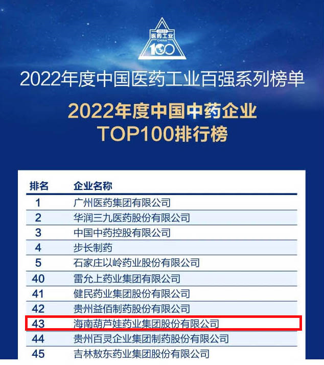 会议期间,一年一度的中国医药工业百强系列榜单隆重揭晓,ks凯时药业集团凭借领先的研发优势和扎实的生产实力以及稳健的市场推广能力,连续第四年成功入选“2022年度中国中药企业TOP100排行榜” ,排名稳步上升至第43位。